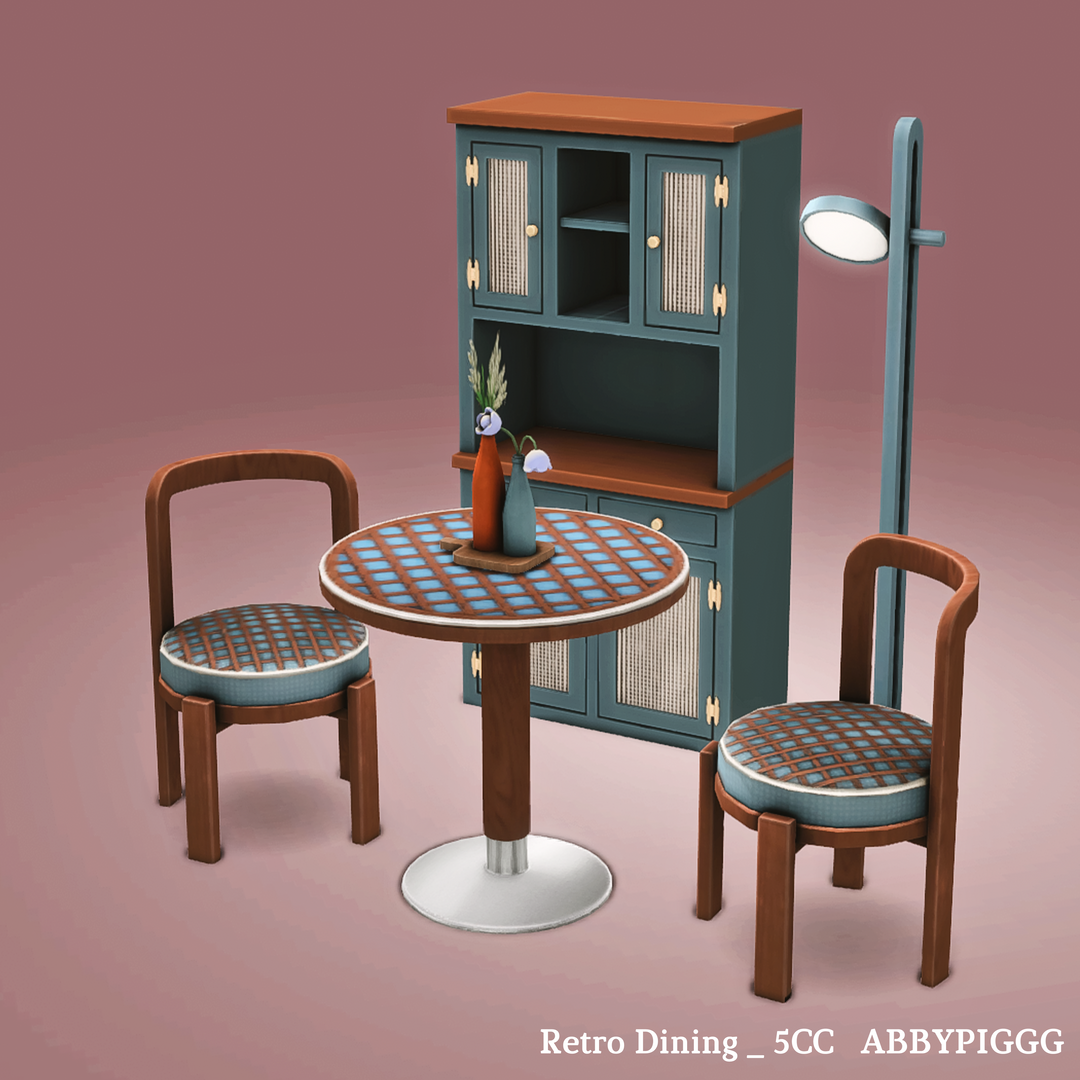 Здесь вы получите следующее: Обеденный стол Обеденный стул Настольная лампа «Ваза» Минималистичный напольный светильник Ретро-шкаф Как найти это в игре: Поиск в режиме покупки сборки: Retro Dining или AbbyPIGGG