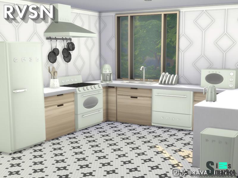 Мод для Sims 4 - набор интерьера для кухни в стиле прошлого века, содержит малые объекты сета