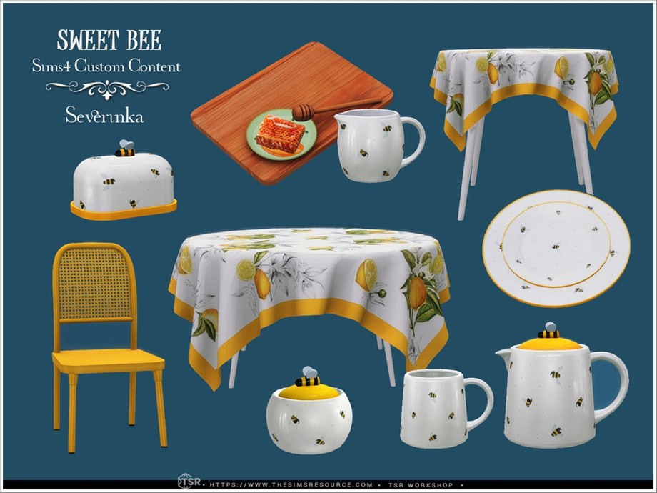 Комплект мебели и декора для оформления столовой, кухни или террасы в весеннем стиле. Милые пчёлки и яркие солнечные цвета украсят любой весенний интерьер, создадут уют и весеннее настроение! - обеденный стол на 4 персоны - обеденный стол на 6 персон - обеденный стул - поднос с мёдом - чайник - кружка - молоко - тарелки - сахарница - маслёнка Для установки стола на 6 персон потребуется набор Backyard Stuff Pack: