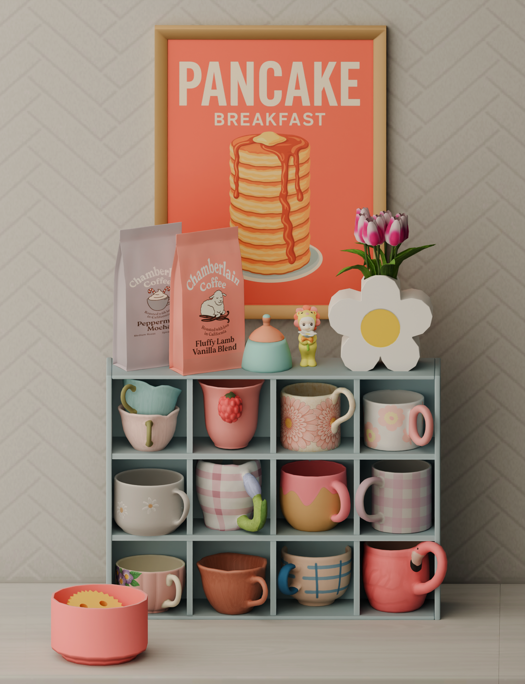 Набор для питья Cozy Sips Set создан для неспешных утренних часов и уютной кухни! Этот набор включает в себя милые кружки и уютную полку, которая добавит тепла и индивидуальности любому помещению. Идеально подходит для кофейных уголков, уголков для завтрака или просто для заполнения пустого места на кухне. Эти кружки призваны сделать дом вашего Сима еще более уютным.♡ Что входит в комплект: 11 кружек для декора Кофейный мешок Сонни Энджел Сахарница ○ Ваза для тюльпанов ○ Губка ○ Настенный постер ○ Полка для кружек