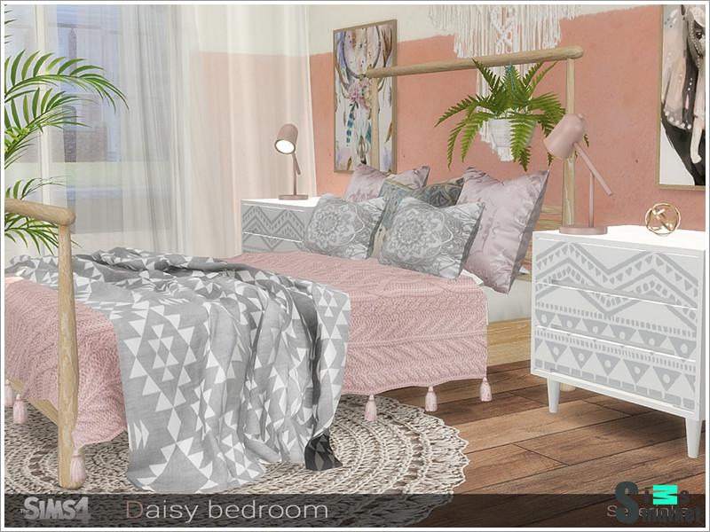 Мод для Sims 4 - набор фурнитуры для спальни, включает в себя 11 объектов: двухспальную кровать, два типа подушек, рабочий стол, кофейный столик, подставка для кофейного столика, тканый плед с помпонами, односпальное и двуспальное одеяло, постер, макроме, картина