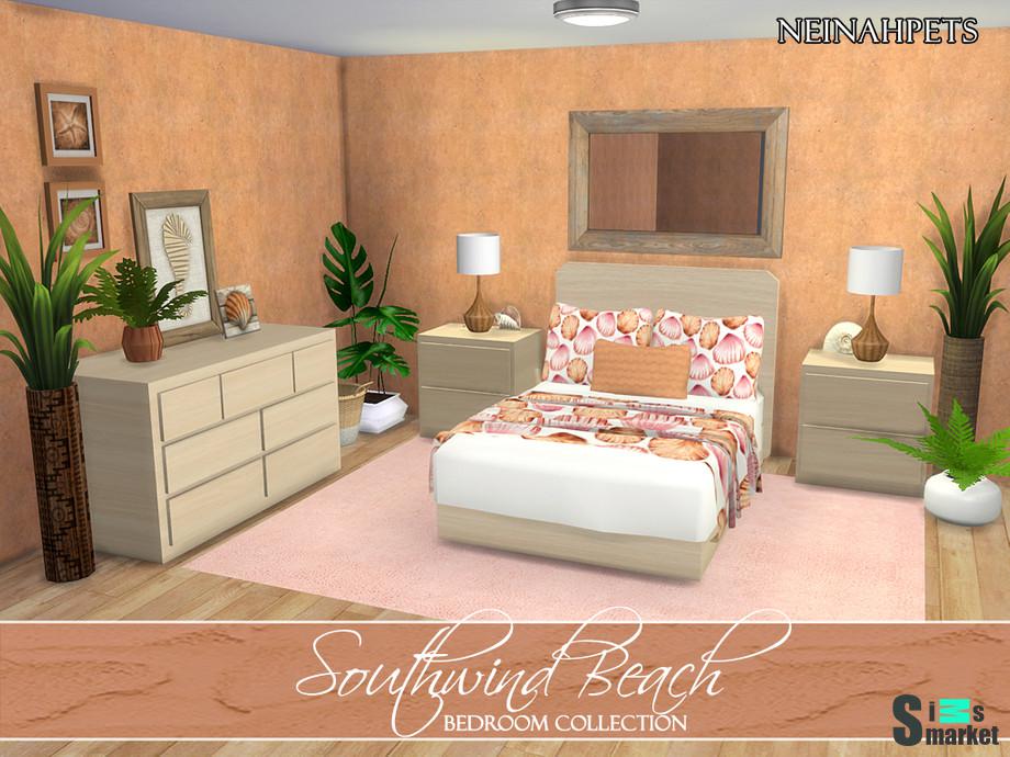 Мод для Sims 4 - спальня с мотивом морских ракушек. Новая сетка Комплект включает: Двуспальная кровать Подушки для кровати Коврик Покрывало на кровать Комод Тумбочка
