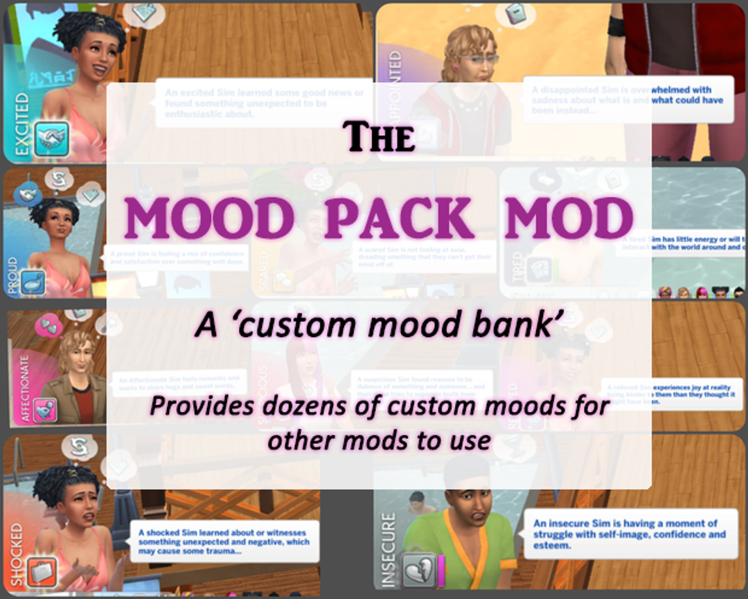 Этот мод добавляет в игру десятки настроений, которые другие моды могут использовать в своих модлетах, для большего разнообразия и более четкого повествования. А теперь рассмотрим данный мод более подробно. - Добавлены новые мудлеты. - Добавлены следующие настроения: в некоторых случаях они имеют две фазы интенсивности. - нежность - встревоженность/волнение - смущение - разочарование - отвращение - рассеянность - восторженность - великодушие - страдание/предательство - нерешительность - неуверенность - лень - одиночество - злость - непонимание - продуктивность - гордость - затворничество - расслабленность - облегчение - испуг - потрясение - сожаление/раскаяние - подозрительность - навеселе/пьянство - усталость - замешательство. Настроения не заменяют эмоции от ЕА, а будут видны при определенных обстоятельствах. Мод не работает сам по себе, он предназначен для использования с другими модами данного автора. Переводы: https://disk.yandex.ru/d/hOl4BG4WgqQv6Q , https://drive.google.com/file/d/1l_VOlxqpGo6x30C1AQohcKFg8wgB0Bor/view