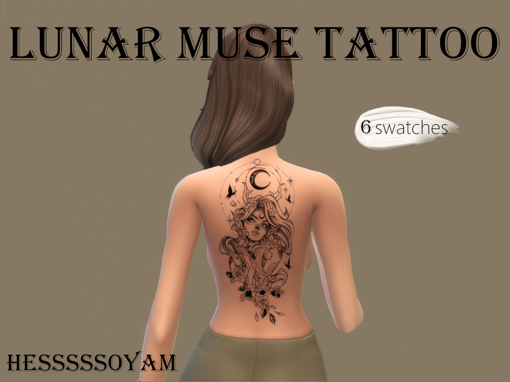 Татуировка на спину для женщин. Изображает девушку с луной, птицами и цветами — нежный и немного таинственный образ. Доступна в 6 оттенках.