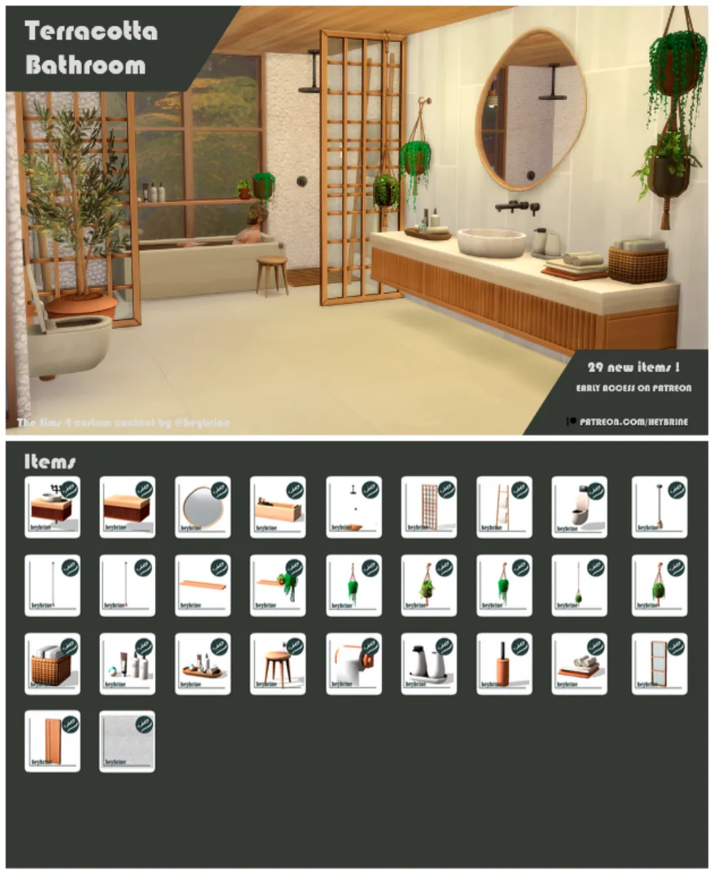 Представляем декабрьский набор, завершающий элегантную серию Terracotta — набор для ванной комнаты в стиле спа . В этот набор входят 26 новых предметов (29, включая варианты), которые помогут вам создать роскошную ванную комнату в стиле спа для ваших симов. Модульная мойка - BGC | 14 вариантов расцветки | 300 долларов Модульная пристройка к раковине - BGC | 7 вариантов расцветки | 300 долларов Organic Mirror - BGC | 6 образцов | 300 долларов Каменная ванна - BGC | 10 вариантов расцветки | 1200 долларов Унитаз Stone Toilet - BGC | 8 вариантов расцветки | 600 долларов Цвет для душа - BGC | 6 образцов | 600 долларов Перегородка для душа - BGC | 6 вариантов расцветки | 200 долларов Полка - BGC | 7 образцов | 100 долларов Полка с растениями - BGC | 7 вариантов расцветки | 100 долларов Табурет для стола - BGC | 5 вариантов расцветки | 100 долларов Декоративная вешалка для полотенец - BGC | 20 вариантов расцветки | 160 долларов Декоративная корзина для полотенец - BGC | 3 варианта расцветки | 50 долларов Декоративные рулоны полотенец - BGC | 10 образцов | 50 долларов Набор для ухода за кожей Decor Skincare Tray - BGC | 10 образцов | 100 долларов Декоративный шампунь и бомбочка для ванны - BGC | 10 оттенков | 50 долларов Декоративный держатель для туалетной бумаги - BGC | 7 вариантов расцветки | 50 долларов Декоративный дозатор для мыла - BGC | 10 вариантов расцветки | 50 долларов Декоративная ёршик для унитаза - BGC | 11 вариантов расцветки | 50 долларов Шорты Ceiling Plant Short - BGC | 10 образцов | 50 долларов Потолочное растение среднего размера - BGC | 10 образцов | 50 долларов Настенное растение 1 - BGC | 10 образцов | 50 долларов Настенное растение 2 - BGC | 10 образцов | 50 долларов Настенное растение 3 - BGC | 10 вариантов расцветки | 50 долларов Потолочный подвесной светильник - BGC | 3 варианта высоты | 6 вариантов расцветки | 110 долларов Дверь - BGC | 7 образцов | 200 долларов Окно - BGC | 7 образцов | 150 долларов Каталог сборок: Плитка из гальки - BGC | 5 образцов | 2 доллара