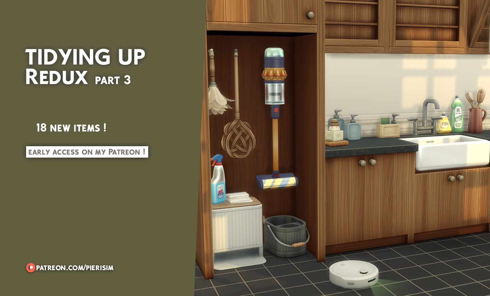 Представляем вам последнюю часть TIDYING UP Redux! В неё входит несколько других видов мыла и других продуктов, которые идеально подойдут для оживления вашей кухни или уборной! Вы также найдёте робота-пылесос и пылесос, которыми сможет пользоваться ваш сим! Для обоих требуются дополнение «Кошки и собаки» и набор «Bust the Dust», но я также добавил их в качестве декоративных предметов, так что вы сможете получить их даже в базовой игре! Робот-пылесос состоит из двух частей, в отличие от того, что идёт в комплекте с игрой «Кошки и собаки», но он крепится к док-станции и после этого работает идеально!