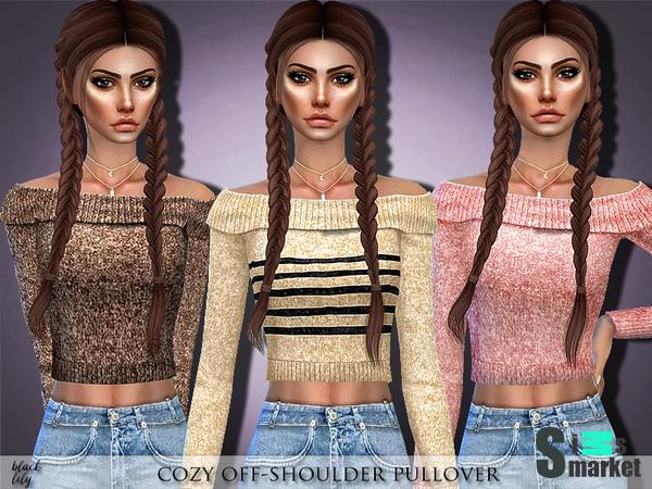 Мод для Sims 4 - блестящий пуловер с открытыми плечами, в расцветках представленных на картинке.
