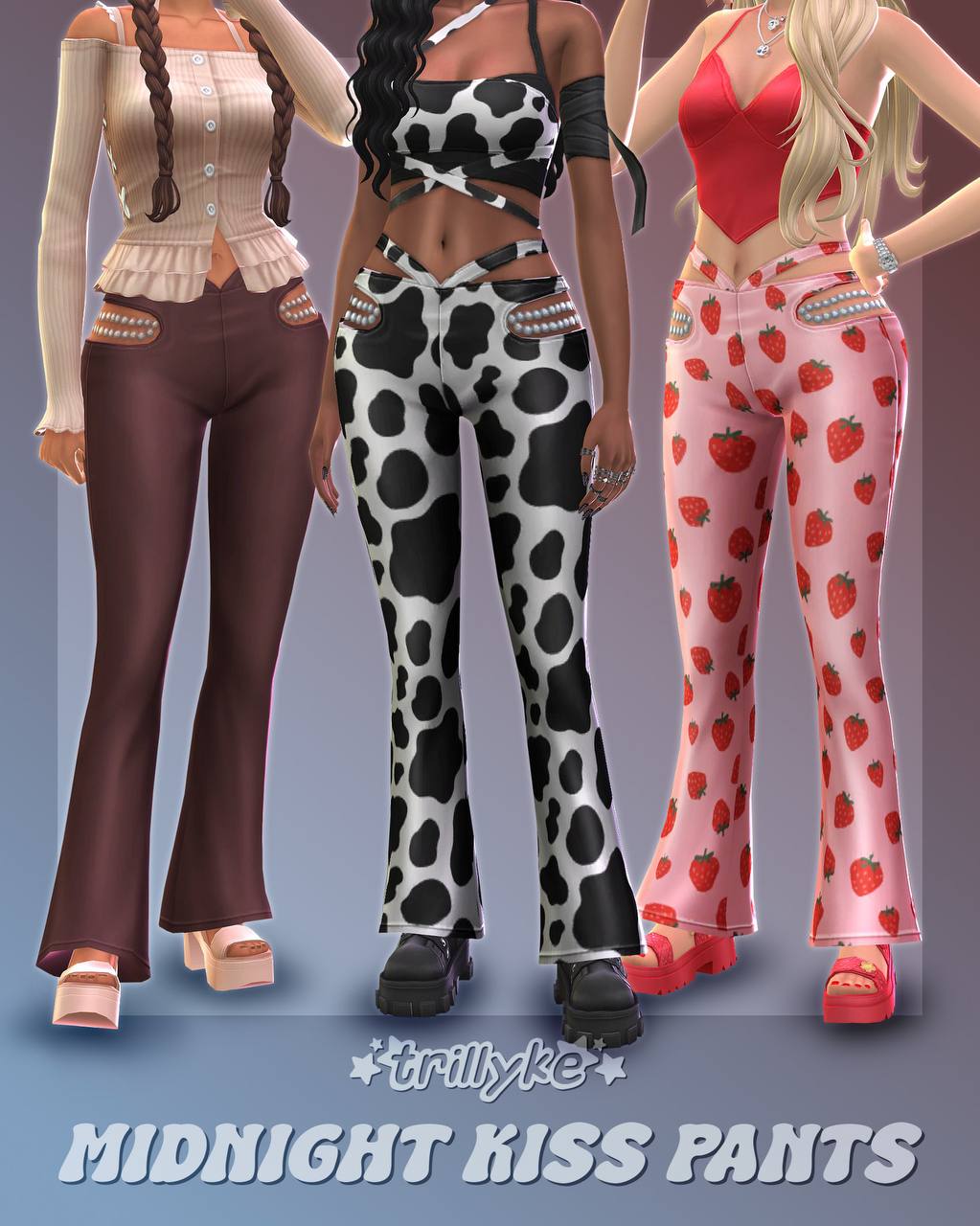 Брюки «Полуночный поцелуй» Слегка расклешенные брюки с заниженной талией, забавными вырезами и деталями из жемчужных цепочек. ✨ пользовательская миниатюра 35 образцов совместимо с базовой игрой